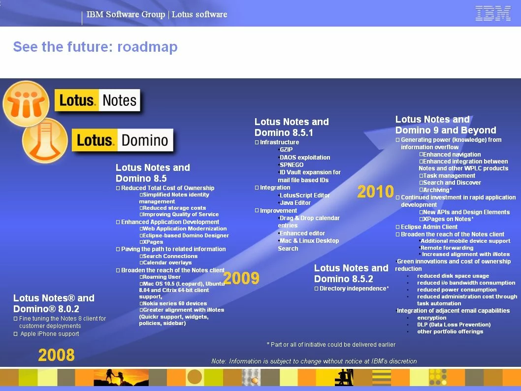 Между прочим, почитайте инфу о "проекте Вулкан", которая вроде бы будет следующей версией Lotus Notes. Информация скудная, но судя по всему мы получим "гугл-мейл + фичи" от IBM.