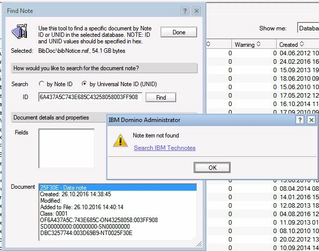 Товарищи, теперь совсем в другой базе другая подстава - родительский документ пропал. Есть его UNID, если по нему искать, то выдает вот такое - Note Item Not Found (см. картинку), при этом все признаки наличия документа есть. И ScanEz говорит, что находит 1 Note, у которого даже респонс есть - все правильно.