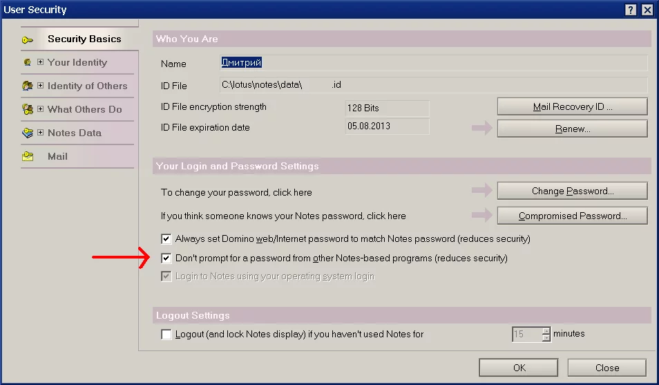 You want to roll out Lotus Notes® to your users with the security setting, "Don't prompt for a password from other Notes-based programs (reduces security)" enabled. Where is this setting stored and is it possible to enable it via a security policy?