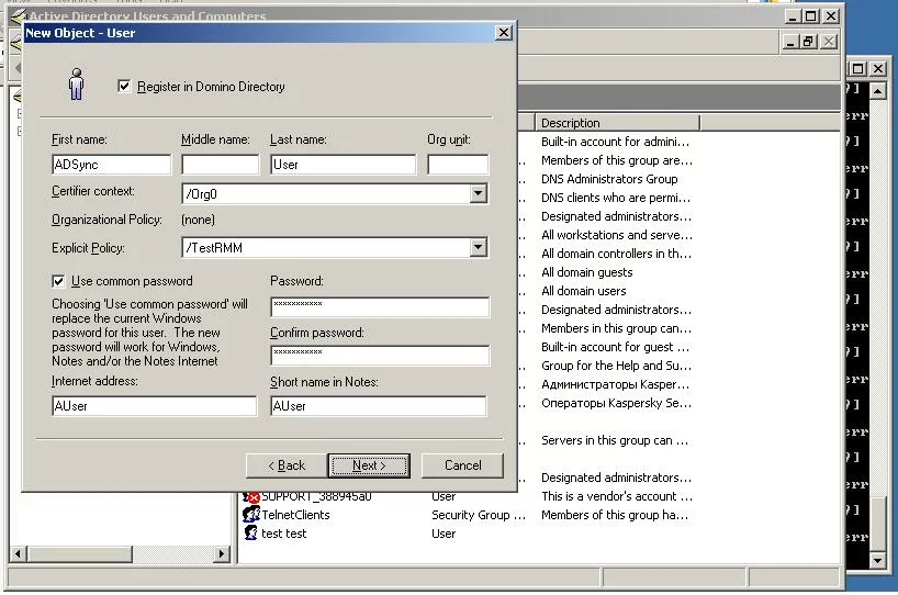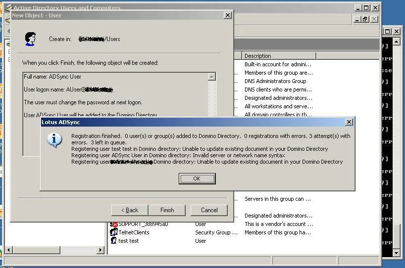 Lotus adsync: invalid server or network name syntax.