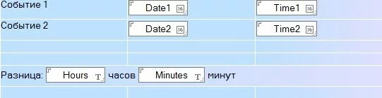 Есть поля типа дата/время: Date1, Date2, Time1, Time2. Даты вида 02.05.12, время вида 10.25. в текстовые поля Hours и Minutes нужно занести разницу между двумя событиями (Date1:Time1) и (Date2:Time2). вопрос в том, как мне подсчитать разницу между событиями и звписать в текстовые поля Hours и Minutes (желат на собако-формулах) Причем результат должен сразу выводиться после ввода данных