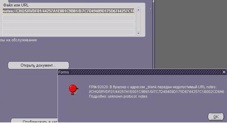 При попытке открытия документа СЭД из OEBS появляется ошибка (см. скриншот). Помогите решить проблему! При открытии обычных ссылок функционал работает нормально.