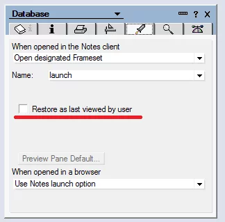 Всем привет. Есть такая проблема. Создается БД, в аутлайне ссылки идут на вьюхи из других секретных БД типа Персонала (чтобы не предоставлять всем доступ к другим секретным БД организовывается отдельный вход, так сказать). В свойствах БД прописывается на открытие в клиенте "открыть фреймсет". Описание проблемы - у некоторых пользователей при попытке открыть эту БД открывается вид как у обычной пустой БД с неименованной вьюхой единственной. Приложу картинки на всякий случай чтобы было понятнее