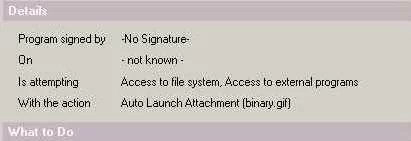 Форма ответа имеет автозапуск этого аттача при открытии. Получаем уведомление ECL о действии обращение к стороннему приложению, которое не имеет подписи... Очевидно, ставить "разрешать всегда" нельзя...
