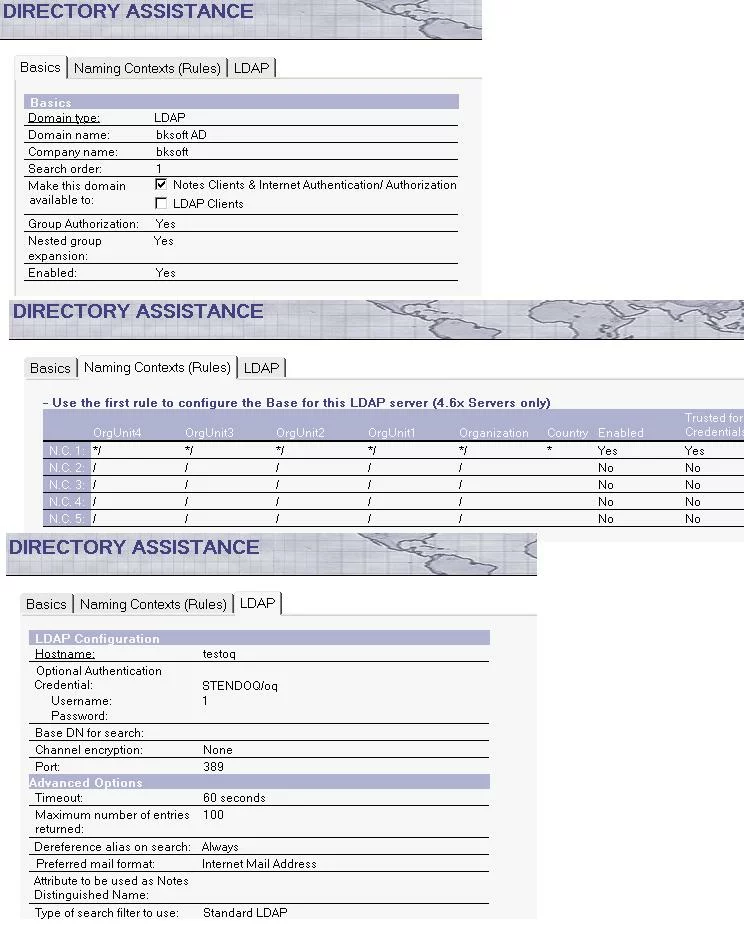 2. поднят lotus domino и настроен доступ пользователей из списка active directory по средствам ldap с использованием базы da.nsf (directory assisments)