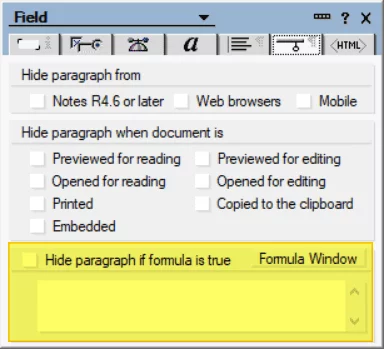 Выделенная область формы вместе с полями, метками и пр. может быть скрыта с помощью формулы, которая должна вернуть @true или @False