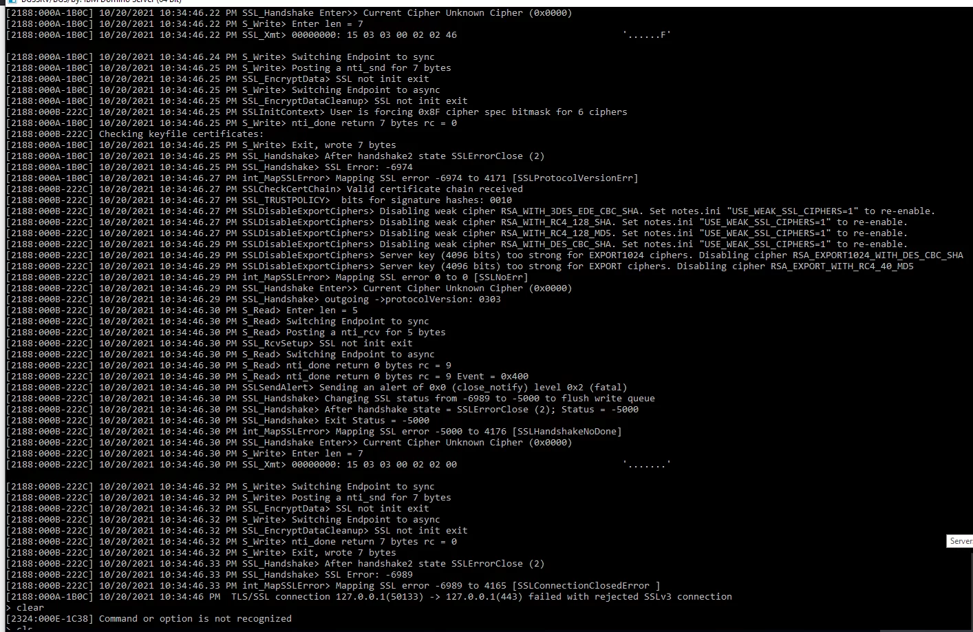 Ну вам в консоли понятным английским языком пишут, какой параметр включить в notes.ini, если вы по-прежнему хотите использовать слабые и небезопасные cipher.
