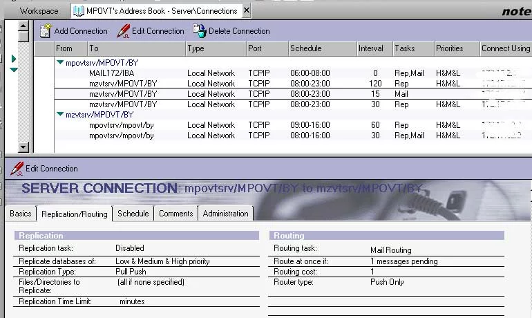 Есть пять сервреров в одном нотес домене. Сервер1 является как-бы центром остальные сервера соединяются с центром по удаленному доступу на один и тот же номер (у каждого есть свое расписание которое не пересекается).